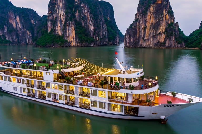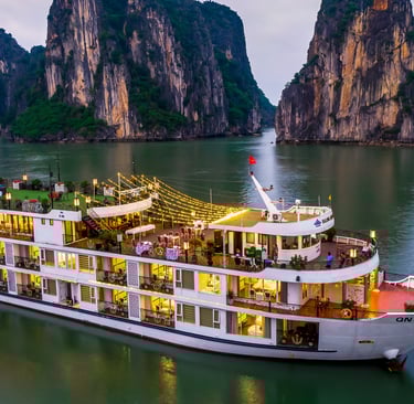 19:30 – Dinner on Top Deck Indulge in a sumptuous dinner on the top deck while taking in the panoramic views of Halong Bay. Let our expert staff take care of all the details.