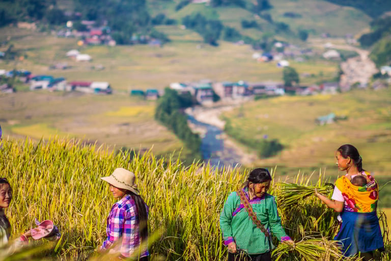 8:30 Trek to Y Linh Ho, a village is located at flank of mountain. The village is surrounded by Hoang Lien Son mountain range. Hit on your eyes is rice terraces and along Muong Hoa Stream to the Black Hmong village of Lao Chai. You can see the local people are working on their fields as well as children are playing with friends carefreely. We then trek to Ta Van village - home of Dzay ethnic people. You will see the picture of rice fields and small houses near there. Its atmosphere is quite peaceful with wild nature, it is an ideal place for you to run away from busy life.